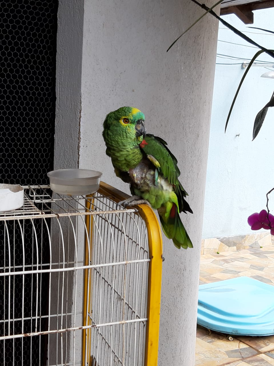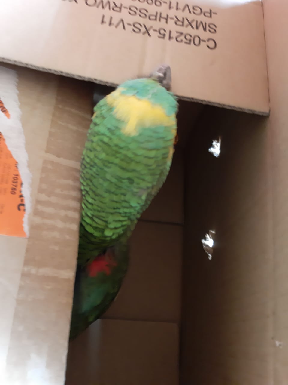 A equipe observou que a ave apresentava-se sem penas na região do peito e segundo a autora foi o próprio papagaio quem as arrancou, o que pode ser explicado pela forma cativa de vida. A ave foi apreendida e encaminhada ao Centro de Reabilitação de Animais Silvestres – C.R.A.S.