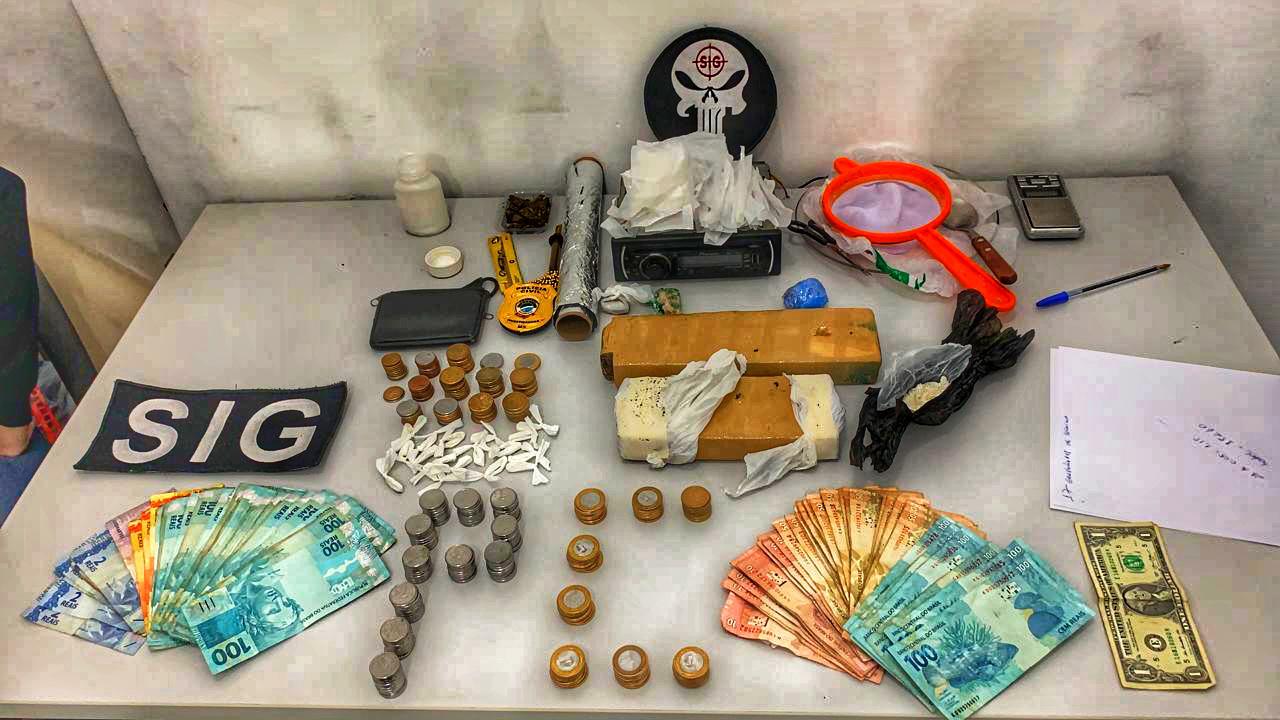 Com os presos, foram apreendidos mais de um quilo de maconha, várias trouxinhas de pasta base e cocaína, cerca de R$ 5 mil sem comprovação de origem, petrechos para o preparo da droga, como balança de precisão, peneira, tesoura, plásticos e outros itens possivelmente ilícitos. Quatro dos suspeitos têm passagens por tráfico de drogas e três deles utilizavam tornozeleira eletrônica.
