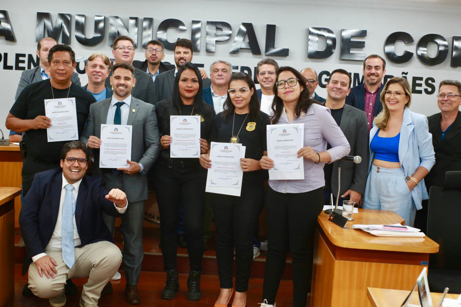 A Câmara Municipal de Corumbá, na sessão legislativa do dia 23 de maio de 2023, aprovou moção de congratulação agraciando o Delegado de Polícia Titular da Delegacia de Atendimento à Infância Juventude e Idoso (DAIJI/Corumbá) – Hugo Japiassú Santos Fonseca. Além da autoridade policial, os Investigadores de Polícia Valdemir Ortiz, Franciele Duarte e Isabel Garcia, bem como a agente administrativa Leticia Chavarria, também receberam a honraria.