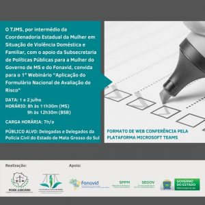 Campo Grande (MS): Teve início na manhã de hoje (1º), 1º Webinário “Aplicação do Formulário Nacional de Avaliação de Risco”, realizado pelo Tribunal de Justiça, por intermédio da Coordenadoria Estadual da Mulher em Situação de Violência Doméstica e Familiar, com apoio da Subsecretaria de Políticas Públicas para a Mulher do governo do MS e do Fonavid.