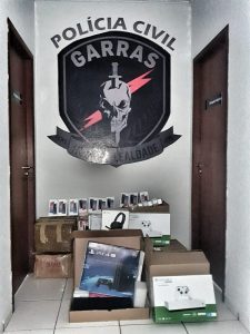 Foram apreendidos 10 (dez) celulares Xiaomi Redmi 9S, 3 (três) vídeo game: XBOX e PS4, 8 (oito) caixas de produtos de tabagismo, entre outros objetos.