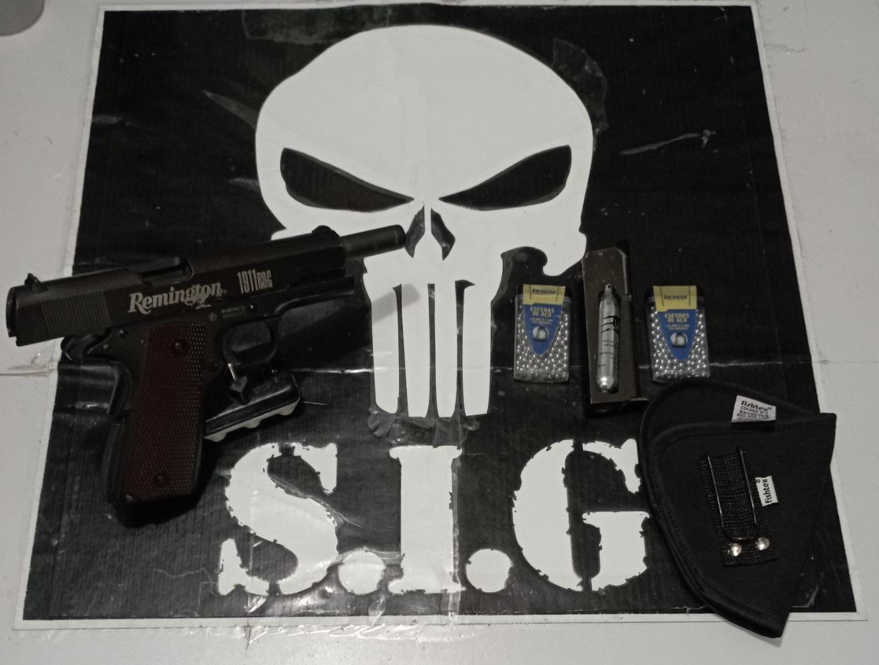 Imediatamente, a equipe saiu em diligências pela cidade e logrou êxito em abordar o suspeito, que estava na posse de uma pistola de gás comprimido, com características idênticas a de uma arma de fogo e sem a ponteira laranja/vermelha (item obrigatório).