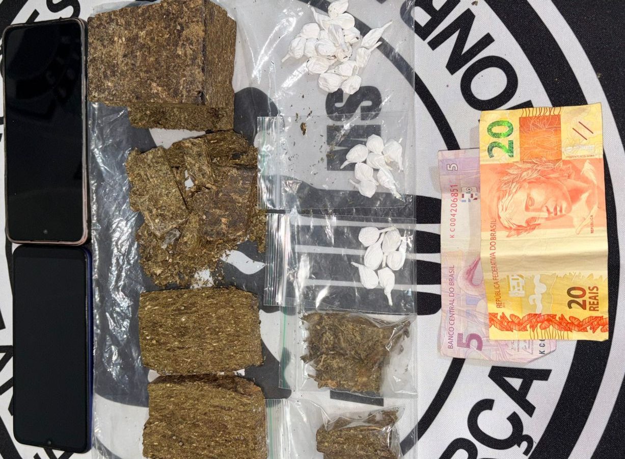 Durante a abordagem, foram encontradas duas porções de maconha já fracionadas no bolso da bermuda do investigado. Em continuidade às diligências, no interior do imóvel foram localizados 1 pote contendo maconha e ainda 33 porções de cocaína, todas embaladas e prontas para a revenda.