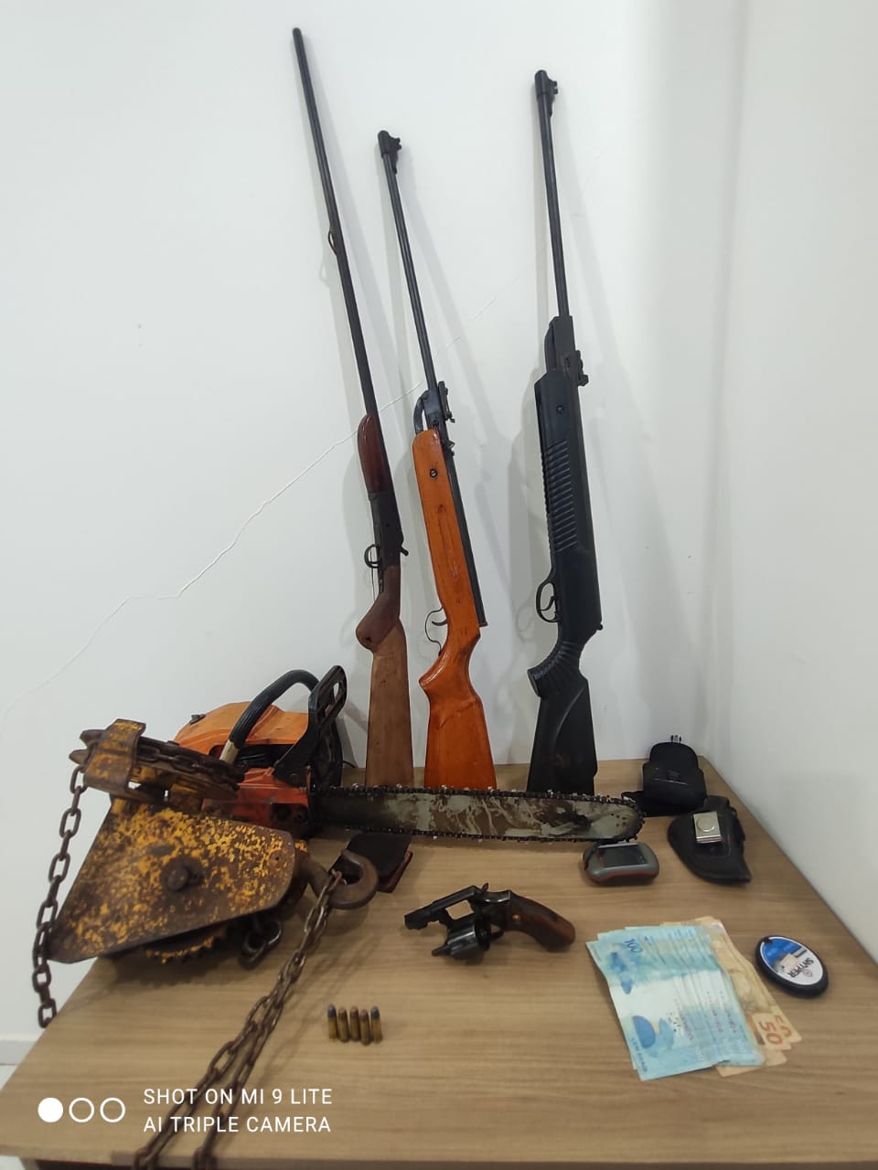 Os policiais localizaram, em cima do guarda-roupa do quarto um revólver calibre .38, Taurus, 5 munições calibre. 38, uma arma de calibre 22 (modificada). Na estante da sala, uma arma calibre 36, sem marca aparente. Atrás da porta de outro quarto, foi apreendida uma arma de pressão de calibre 5.5. Na sala foram apreendidos um 1 GPS, um coldre e R$ 1.450,00.