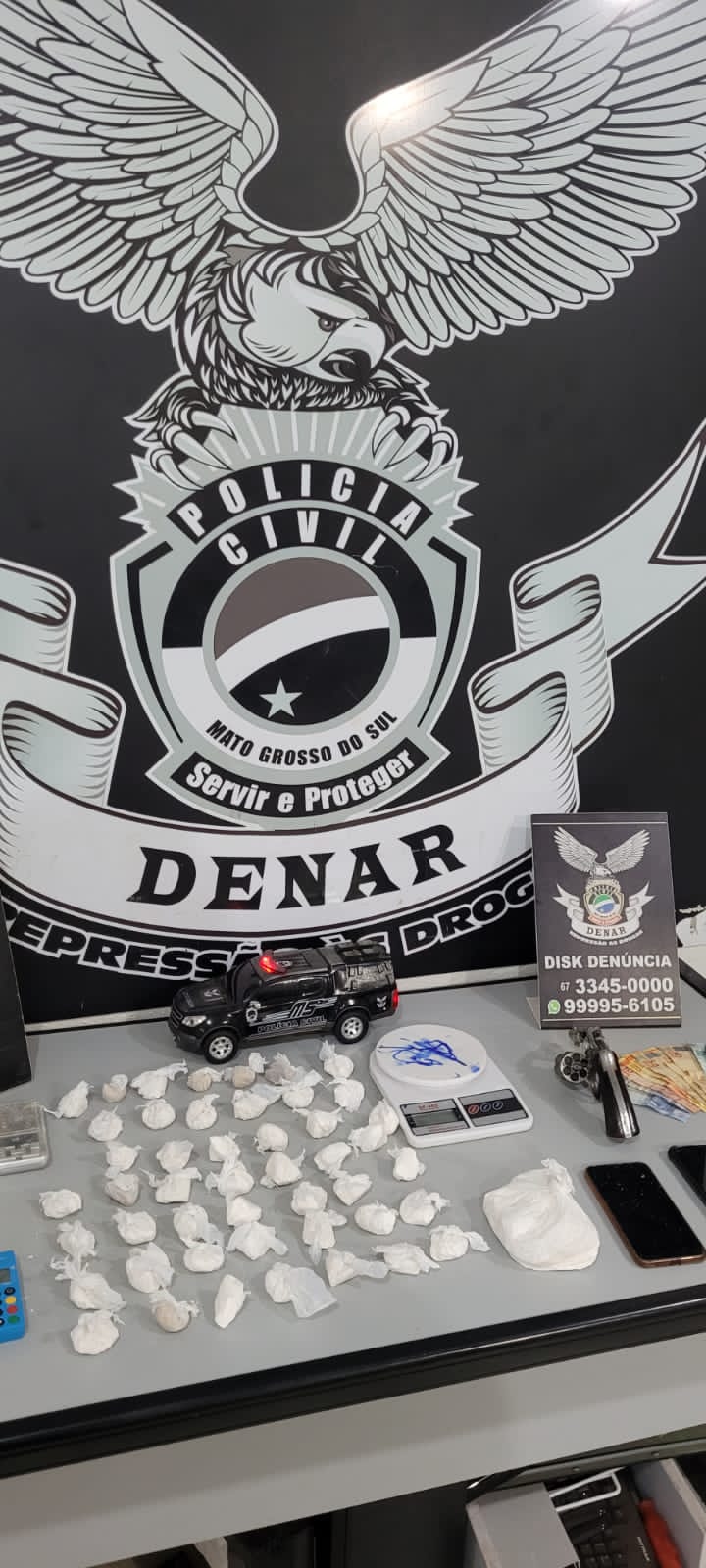 Campo Grande (MS): Policiais civis da Delegacia Especializada de Repressão ao Narcotráfico-Denar prenderam em flagrante, na tarde de ontem (28), um homem, de 25 anos, que vinha comercializando entorpecentes na modalidade de disque entrega.Foram apreendidos 47 porções de cocaína, pesando o total de 700 gramas, um revólver calibre 38, balanças de precisão, veículo e dinheiro fruto do tráfico.