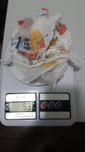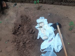 Em continuidade às buscas, os policiais encontraram enterrado no quintal, dois tabletes grandes de maconha, pesando 2,2 kg, e 53 gramas de pasta-base de cocaína.