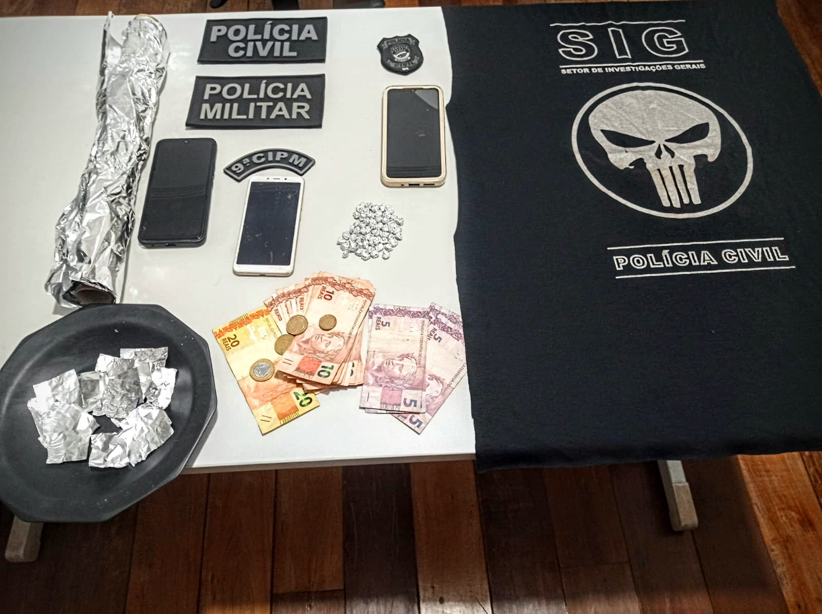 Diante de indícios veementes de ocorrência de crime permanente na localidade, a autoridade policial determinou os procedimentos de busca, ocasião em que as equipes das Polícias Civil e Militar encontraram 7 pedras de crack em um dos cômodos e mais 46 pedras no interior de uma das botinas do suspeito, além de valores fracionados em real.
