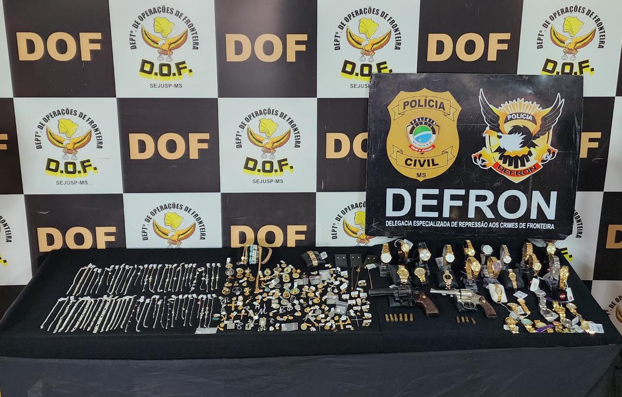 Policiais Militares do DOF (Departamento de Operações de Fronteira) em conjunto com Policiais Civis da DEFRON (Delegacia de Repressão aos Crimes de Fronteira) apreenderam na manhã desta terça-feira (17), em Caarapó-MS, 261 peças de joias roubadas durante um assalto a uma relojoaria na área central da cidade.
