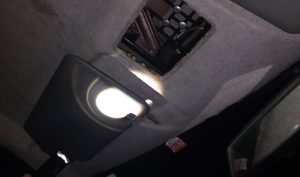 Durante buscas realizadas no interior do veículo, foi localizado um fundo falso no forro do teto do veículo, onde foi encontrado o revólver calibre .38 da marca Taurus com numeração suprimida, carregado com quatro munições do mesmo calibre.