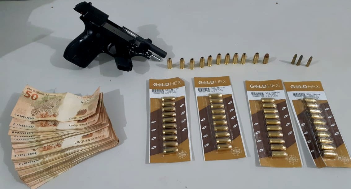 Durante sua prisão foi apreendido uma pistola calibre 380, várias munições de calibre 380, R$ 5 mil reais em espécie sem origem comprovada, e ainda uma chave reserva de um caminhão modelo Iveco.