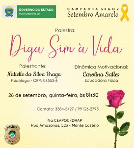 Campo Grande (MS) – A Secretaria de Governo de Mato Grosso do Sul e a Polícia Civil promovem nesta quinta-feira (26), às 8h30, no Ceapoc, em Campo Grande, a palestra Diga Sim à Vida, que integra a programação da campanha Setembro Amarelo de conscientização sobre a prevenção do suicídio.