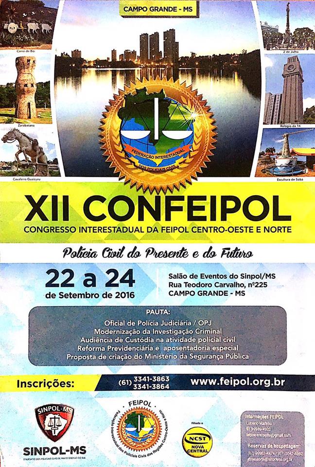 CAMPO GRANDE (MS): O Sinpol-MS – Sindicato dos Policiais Civis de Mato Grosso do Sul sediará, entre os dias 22 e 24 de setembro (quinta-feira e sábado), o XII Congresso da FEIPOL-CON (Federação Interestadual dos Policiais do Centro Oeste), sobre o tema “A Polícia Civil do Presente e do Futuro”.