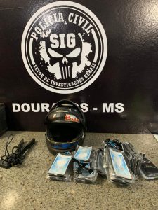 Na casa do investigado foi localizado um dos capacetes utilizados para realizar o roubo, bem como um objeto subtraído da vítima e outros objetos de origem duvidosa, provavelmente de outra ação criminosa dos investigados.