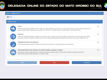 Passou a fazer parte do rol de boletins de ocorrência que podem ser registrados de forma on-line no site pc.ms.gov.br, o descumprimento dos deveres do poderes familiar, guarda e tutela de crianças e adolescentes que trata da infração administrativa do