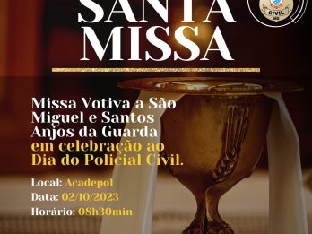 A Delegacia-Geral da Polícia Civil realiza na próxima segunda-feira, 02/10, às 08h30min, uma missa votiva dedicada a São Miguel e aos Santos Anjos da Guarda. A solenidade acontecerá no auditório da Academia de Polícia Civil (Acadepol) em homenagem ao