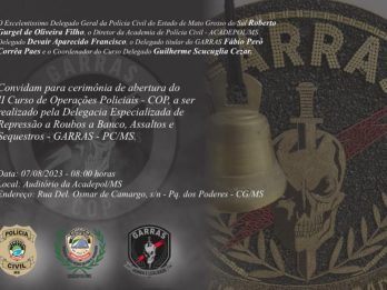 Está agendado para o dia 07/08, a cerimônia de abertura do II Curso de Operações Policiais (COP). A solenidade acontecerá às 8 horas, no auditório da Acadepol, com a presença de diversas autoridades, dentre elas, o Delegado-Geral da Polícia Civil