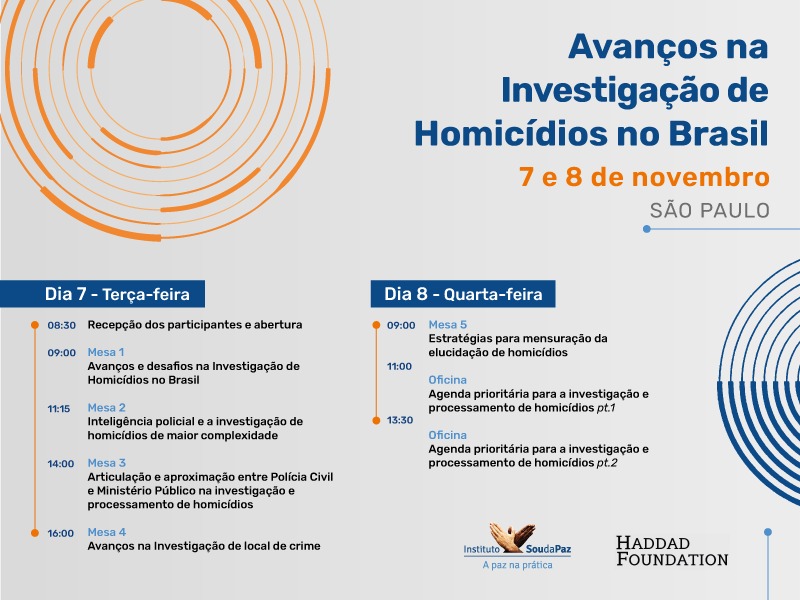 Durante a programação, haverá quatro mesas de discussão com os seguintes temas: Avanços e desafios na Investigação de Homicídios no Brasil; Inteligência policial e a investigação de homicídios de maior complexidade; Articulação e aproximação entre Polícia Civil e Ministério Público na investigação e processamento de homicídios e Avanços na Investigação de local de crime.