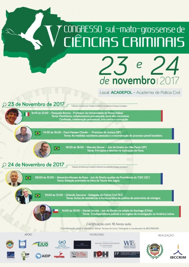 O V Congresso sul-mato-grossense de Ciências Criminais, realização conjunta do Instituto Brasileiro de Ciências Criminais – IBCCRIM e Acadepol – Academia de Polícia Civil de MS, acontecerá nos dias 23 e 24 de novembro de 2017 em Campo Grande (MS).